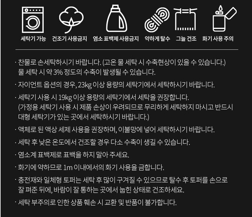 아래 세탁 시 주의사항은 어느 업체의 광고를 보고 캡처한 내용이므로 구매 시 참고만 하시기 바랍니다