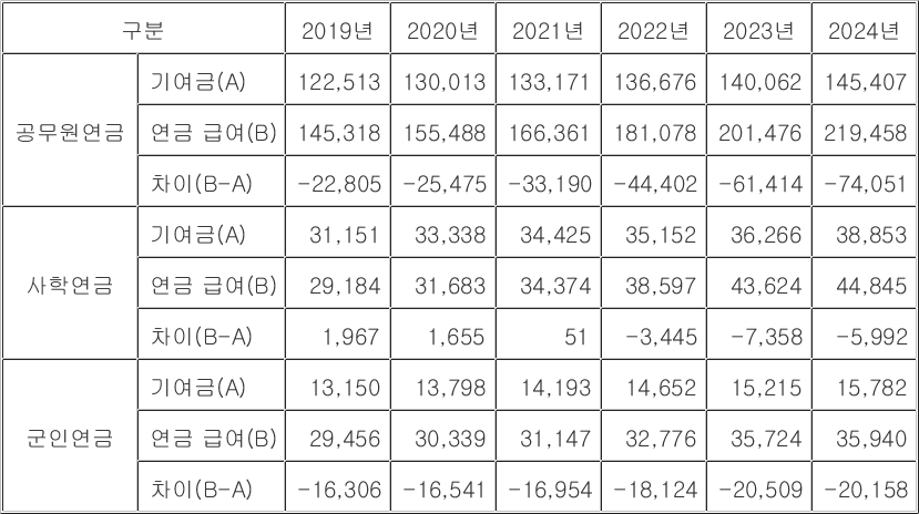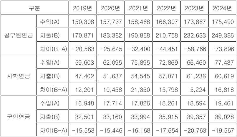 아직 적립 기금이 남아 있어 흑자 운영 중인 사학연금을 제외하고 2024년 기준 공무원연금은 수입이 지출보다 7조3천896억원, 군인연금은 1조9천567억원이 부족하다.