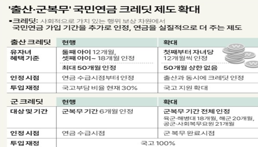 정부도 이런 요구에 맞춰 출산 크레딧과 관련, 지금 같은 사후 지원이 아니라 사전 지원 방식으로 변경하고 국가 책임을 강화하는 쪽으로 검토하고 있다.