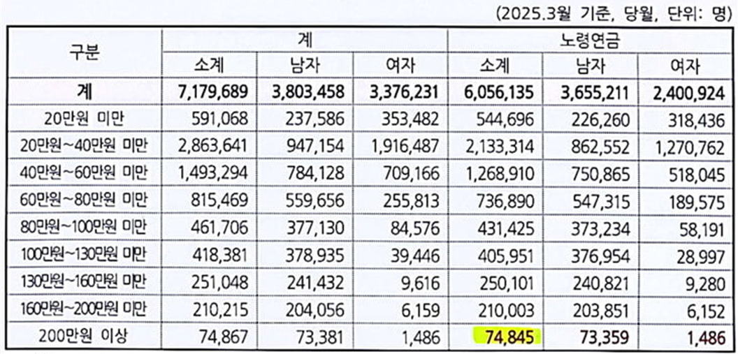 국민연금공단에 따르면 올해 3월 국민연금 노령연금을 매달 200만원 이상 받는 사람이 7만4845명으로 집계됐습니다. 노령연금은 수급 연령(올해 기준 63세)이 되면 받는 국민연금인데요, 2023년 말까지만 해도 1만7805명에 불과했던 것이 1년여 만에 4배 이상 급속도로 늘었습니다.