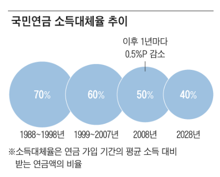 참고로 소득대체율이란, 보험료를 40년 동안 납입했다고 가정하고 이 기간 평균 소득 대비 노후에 받는 연금액 비율을 의미한다. 가령 소득대체율 50%는 월 100만원을 벌던 사람이