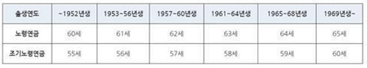 출생 연도로 따지면 1952년생까지만 해도 60세에 노령연금(수급 연령에 도달했을 때 받는 일반적인 형태의 국민연금)을 수령했다.