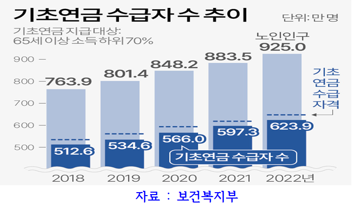 2022년 48만 2천479명에 이어 지난해 59만 1천456명으로 60만 명에 육박했다. 기초연금은 기존의 기초노령연금을 확대 개편해 2014년 7월부터 도입됐다.