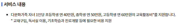 학교 적응이나 학습에 어려움을 겪는 저소득 다문화 자녀에게 학력 격차 해소를 위한 교육활동비를 지원하는 사업입니다