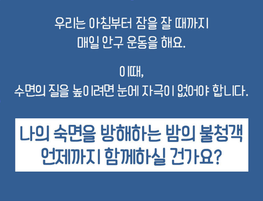 수면안대는 고3 수험생뿐만 아니라 우리 부모님들도 필요합니다. 위 2번과 같이 아침에 일어날 때 몸도 찌뿌둥하고 그날의 컨디션도 좋지 않아 축축 쳐지는 경우나 밤에 과도한 빛이 신체리듬을 망가뜨리고 숙면을 방해하는 경우가 있다면 수면안대를 착용하는 것을 제안드립니다