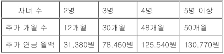 추가로 인정해 주는 제도다. 둘째 자녀를 둘 경우 가입 기간을 12개월 더해주고 셋째부터는 자녀 1명당 18개월을 추가해 최대 50개월까지 인정해 준다.
