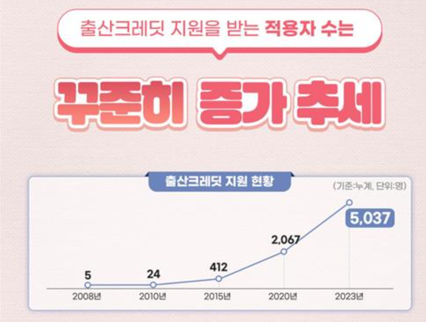 그러다가 2010년 24명에 이어 2014년 287명, 2015년 412명, 2016년 627명, 2017년 888명, 2018년 1천명, 2019년 1천354명, 2020년 2천67명, 2021년 2천959명, 2022년 4천269명, 2023년 5천37명 등으로 매년 꾸준히 늘었다. 2024년 6월 기준 출산크레딧 수급자는 5천981명이었다.