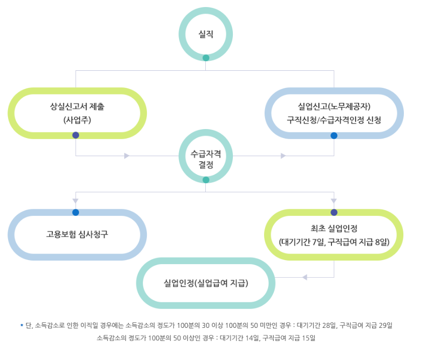 실업신고는 워크넷(Work-net)을 통해 인터넷으로 구직신청을 한 후 직업안정기관에 방문하여 수급자격인정신청서를 작성해 제출하면 되고, 신청 후 2주 이내에 수급자격 인정 여부를 결정해 통지받게 됩니다. 단소득감소로 인한 이직일 경우에는 신청 후 4주 이내입니다.