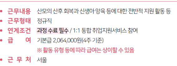 | 사업 한줄 소개 | 직무훈련을 통한 산모·신생아 건강관리사 양성과정을 수료 후 산모피아 소속 관리사로서 일 연계 지원 | ||
