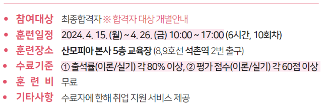 | 교육기간 | 2024-04-15~2024-04-26 | 활동기간 | 2024-04-26~2024-11-30 |