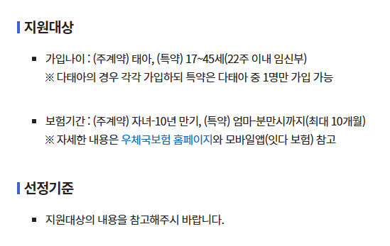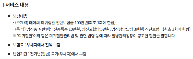 자녀의 희귀 질환과 엄마의 임신질환을 보장하는 공익보험으로 별도의 조건 없이 국가(우체국)에서 보험료 전액을 지원하는 사업입니다