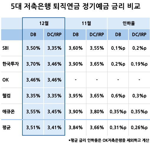 5대 저축은행(SBI·OK·한국투자·웰컴·애큐온)의 이달 평균 퇴직연금 정기예금 금리는 확정급여(DB)형 12개월 기준 3.51%이다. 확정기여(DC)형과 개인형 퇴직연금(IRP)의 경우 3.41%이다.