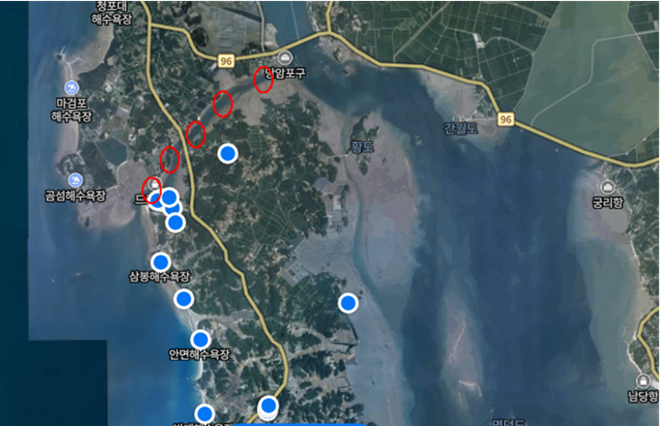 라. 다시 말하면 현수교 및 사장교를 설치하는 지역은 바닷물의 흐름이 너무 강하여 중간에 교각을 설치할 수 없어서 어쩔 수 없이 예산이 많이 소요되더라도 현수교 또는 사장교를 설치할 수밖에 없습니다. 참고로 서울에서 가까운 안면도 입구에 가보더라도 양쪽으로 물의 흐름을 확인할 수 있습니다. (빨간 원 지점)
