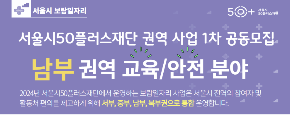 | 공고명 | 2024년 남부권 보람일자리 사업 교육·안전 분야 모집 (서울시50플러스재단 1차 공동모집) | ||