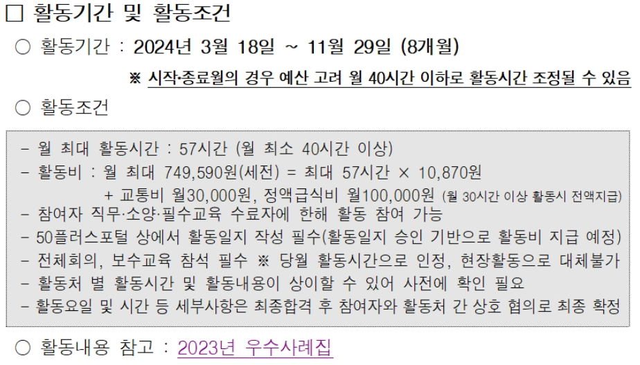 - 월 활동시간(57시간) 중 70%(40시간)이상 활동이 가능한 자