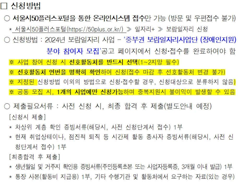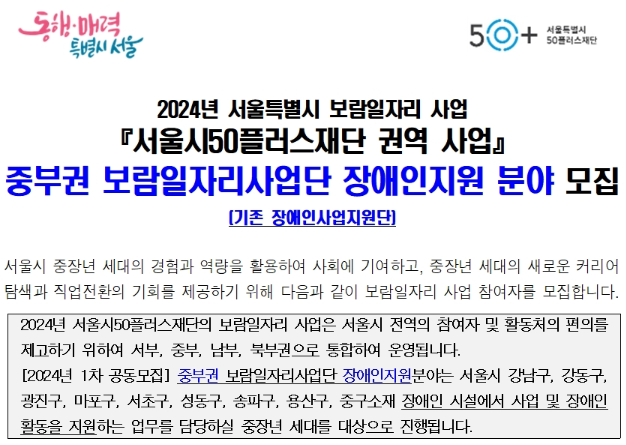 | 공고명 | 2024년 중부권 보람일자리사업단 장애인지원 분야 모집(서울시50플러스재단 1차 공동모집) | ||