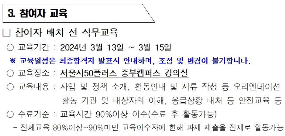 - 참여자 역량교육 수료(90%이상), 소양교육 수료(100%) 가능한 자