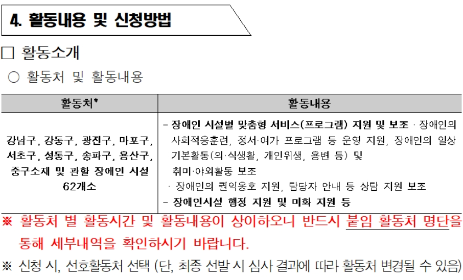 | 활동처 | 서울시 강남구, 강동구, 광진구, 마포구, 서초구, 성동구, 송파구, 용산구, 중구 소재 장애인 시설 | ||