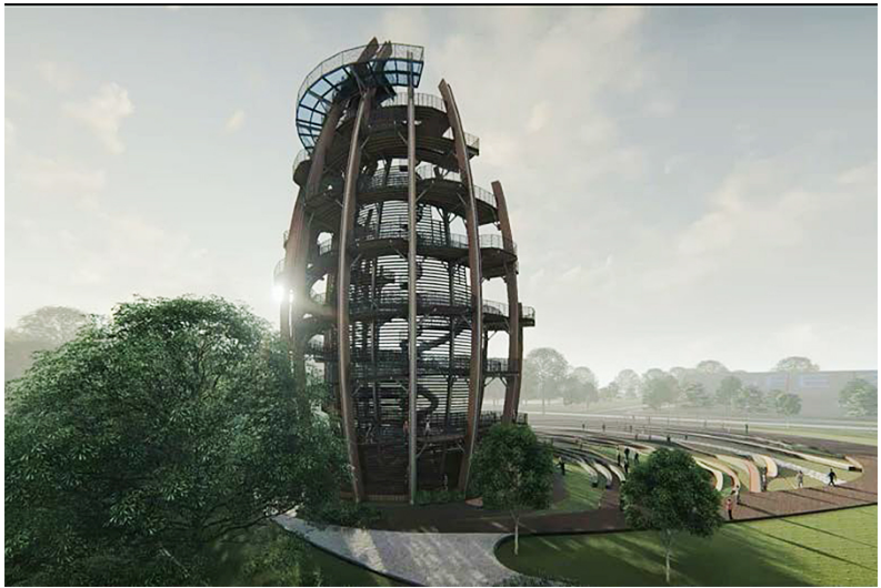 오르는 중간중간에 26개의 포켓 전망대를 마련해 관람객들이 쉬어갈 수 있도록 했다. 상층부로 올라가면서 시시각각 변화하는 경관을 즐길 수 있다. 16m 높이 지점에는 42m 길이의 슬라이드 시설을 설치했다. 8층 상층부는 매시 재질 바닥으로 아래가 보이도록 설계해 스릴감도 만끽할 수 있다.