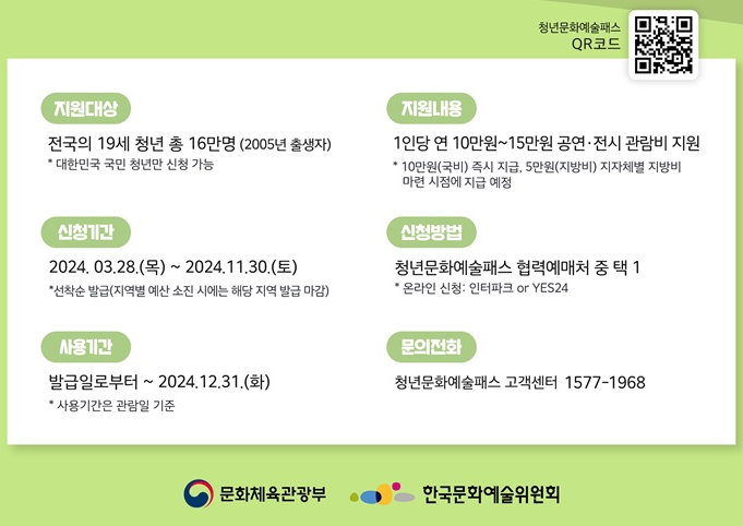 유인촌 문체부 장관은 “젊은 예술인과 청년은 우리 문화예술시장의 현재와 미래를 이끄는 주인공인 만큼 청년 문화예술패스를 통해 젊은 예술인과 청년들이 현장에서 더욱 자주 만나게 되길 바란다”며 “청년들의 문화예술 관람과 참여 확대가 예술인들에게 많은 창작과 실연의 기회로 확장되고, 이로써 우리 문화예술시장에 더욱 큰 활력과 에너지가 넘쳐나기를 기대한다”라고 밝혔다.