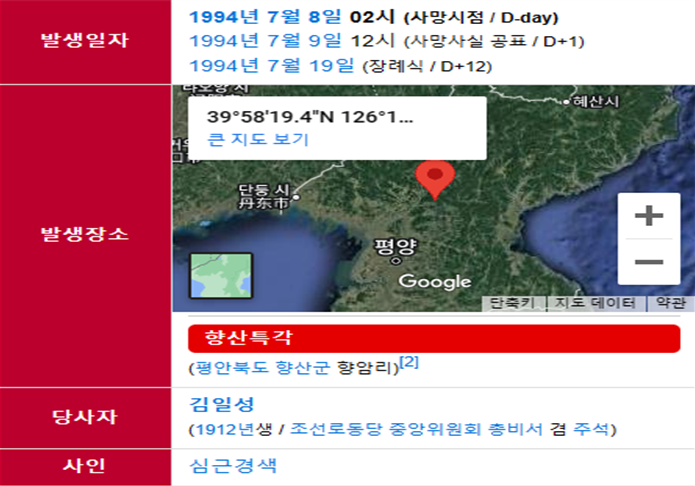 김일성은 1994.7.8.일 새벽2시경 묘향특각에서 돌아가셨다. 그날은 남한의 김영삼 대통령과의 정상회담을 위하여 자료를 보고 있었는데 당번이 몇 번 음료수를 넣어 드린 것 이외에는 없는데 갑자기 이상한 소리가 들려 들어가 보니.