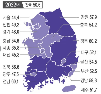 지금은 4가구 중 1가구가 고령자 가구인데, 30년 뒤엔 한 집 걸러 한 집이 고령자 가구가 된다는 뜻이다. 지역별로 보면 2052년 65세 이상 고령자 가구 비중은 경북(60.2%), 전남(60.1%), 경남(59.3%) 순으로 높다.