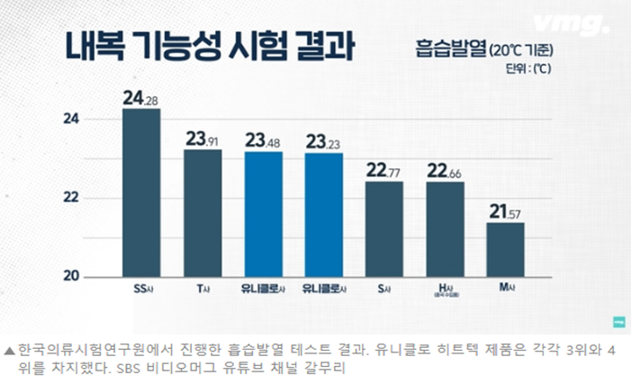 SBS는 최근 국내 브랜드 제품과 유니클로(일본제품) 제품, 그리고 중국 브랜드 제품 등 5개를 직접 구매해 국가공인기관인 한국의류시험연구원에 ‘흡습발열’ 시험을 의뢰해 발열 기능에 대한 결과를 보도했다.