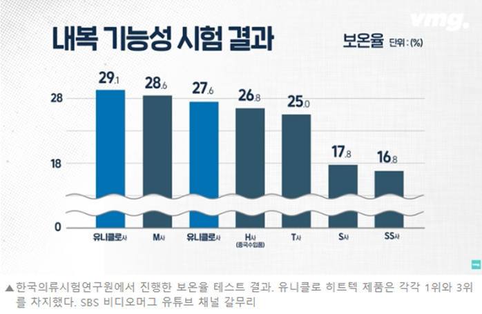SBS는 1, 2위를 차지한 국내 브랜드 제품을 착용한 결과 20도였던 온도가 5분 만에 최대 4도까지 더 올라갔다고 소개했다. 한발 더 나아가 국내 제품이 유니클로(일본제품) 보다 가격도 저렴해 가성비 측면에서도 앞서는 것으로 파악됐다.