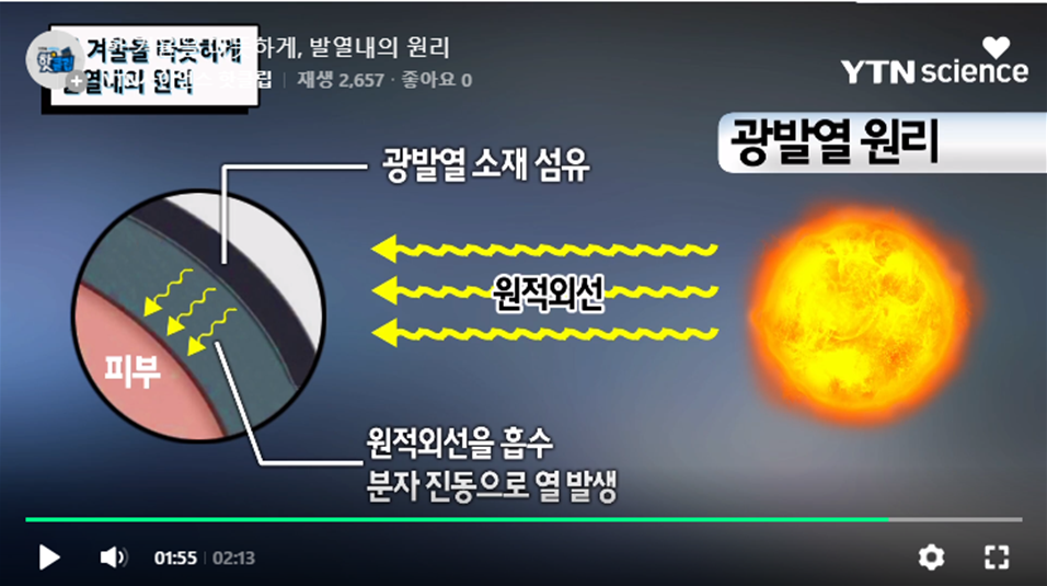 - 태양광에서 원적외선이 방출되면 피복(발열내의)에 닿아 광발열 섬유가 원적외선을 흡수하여 분자진동으로 열을 발생하여 피부에 공급함으로써 우리 몸을 따뜻하게 하는 원리입니다.