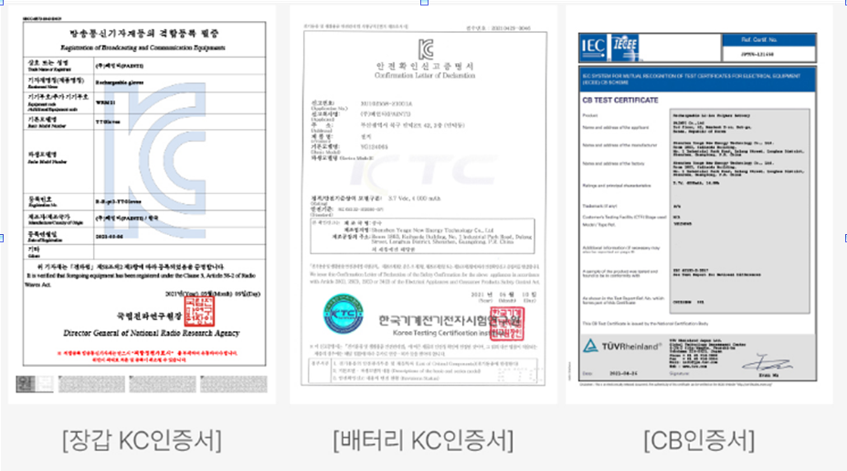 발열장갑은 배터리를 사용하는 방한용품이므로 안전이 걱정됩니다. 이에 따른 검정방법으로 인증서가 있는데 인증서로는 장갑KC인증서, 배터리KC인증서, CB인증서 등 3종류가 있으니 구입시 참고하시기 바랍니다.