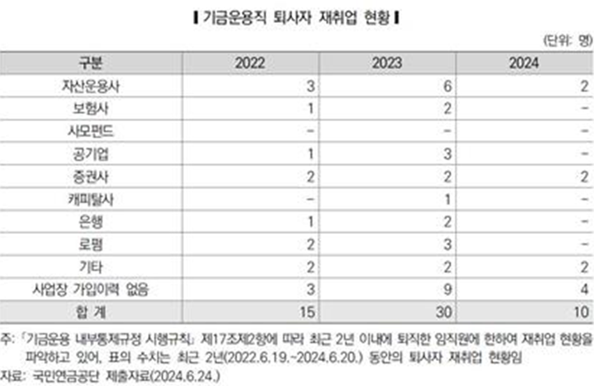 하지만 퇴직자의 재취업에 대한 심사 규정은 없다. 국민연금공단은 기금운용본부 임직원이 퇴직 후 민간 금융사에 직접 담당자로 재취업하더라도 해당 회사와의 거래를 6개월간 제한하는 규정만 가지고 있을 뿐이다.