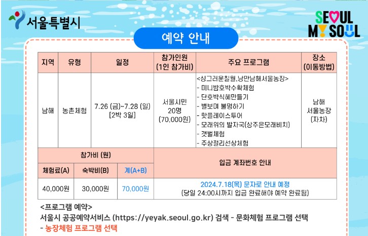 1. 남해 서울농장 신청기간 및 여행기간 안내