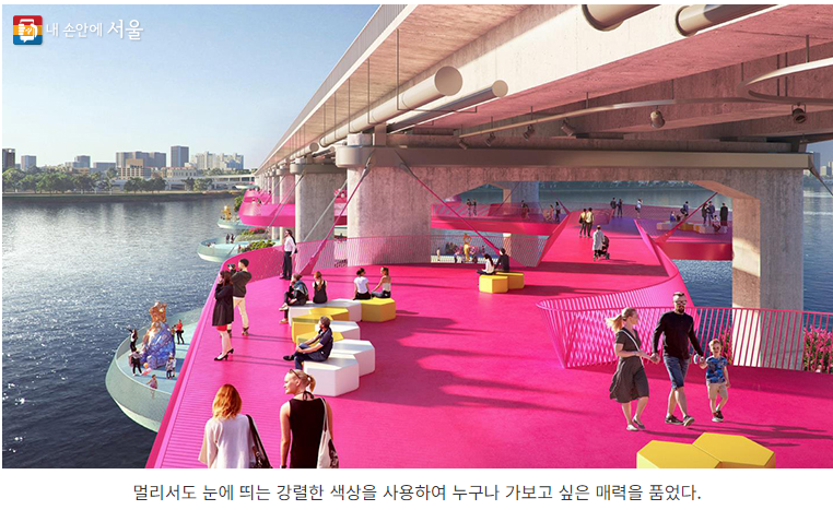 이 작품은 잠수교 위에, 떠 있는 공중 보행다리(DECK)를 조성해 시민들이 공유할 수 있는 공간을 넓혀 입체적인 관람이 가능하게 했고 동시에 한강의 특별한 파노라마 전망도 연속적으로 제공해 시각적 효과를 극대화한 콘셉트다. 또 강렬한 색상을 상징적으로 사용한 점도 높은 평가를 받았다.