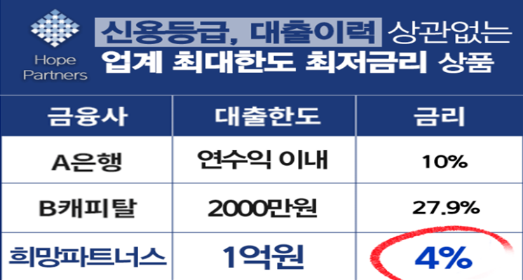 농협의 '희망파트너스'란 특별 서민대출 상품은 업계 최저 금리인 연 4%, 업계 최대한도인 1억까지 지원이 되며, 신청 즉시 99% 승인이 나오기 때문에 문의가 빗발치고 있다.