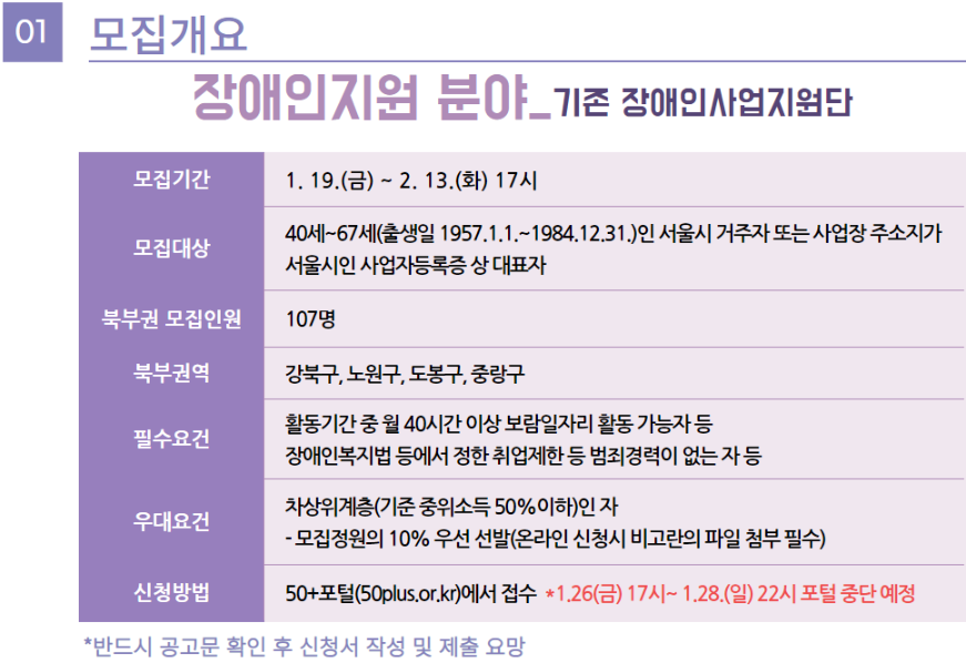 ※ 2024년 북부권 보람일자리 사업 장애인지원 분야 모집 개요