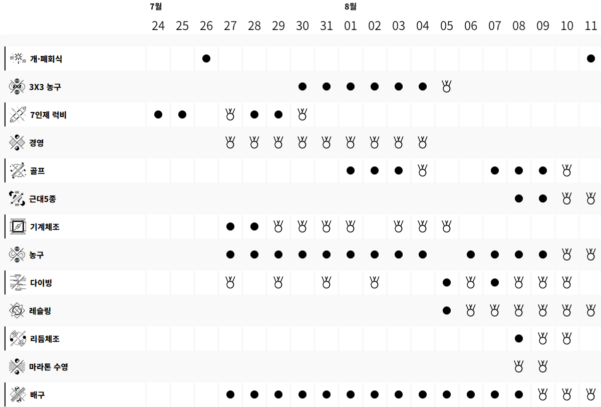 금메달 이벤트가 많이 진행되는 현지 시간 프라임타임 경기는 대한민국 기준으로는 암흑 시간대라서 시청하기 어렵다는 단점도 있다. 2012 런던 올림픽과 거의 똑같다고 보면 된다.